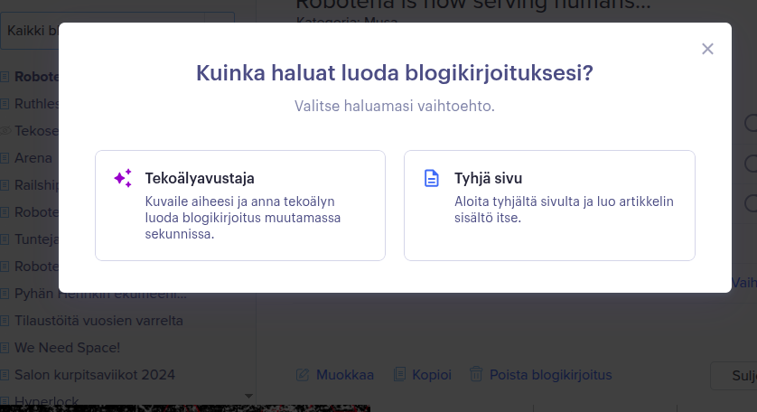 Kun pystytin tämän sivun vajaa vuosi sitten, olin jo hyvän aikaa seurannut kehitystä ja jotenkin ennakoinut, että edes henkilökohtaiset kotisivut ja blogit eivät jää tekoälyltä rauhaan. Nämä sivut on tehty Webnoden maksetulla versiolla ja kun muutama viikko sitten pidemmän tauon jälkeen tänne kirjaannuin ja aloitin uuden sivun tai artikkelin tekemistä, niin vaihtoehdoksi tarjotaan tekoälyavusteista sivua tavallisen tyhjän sivun ohessa.