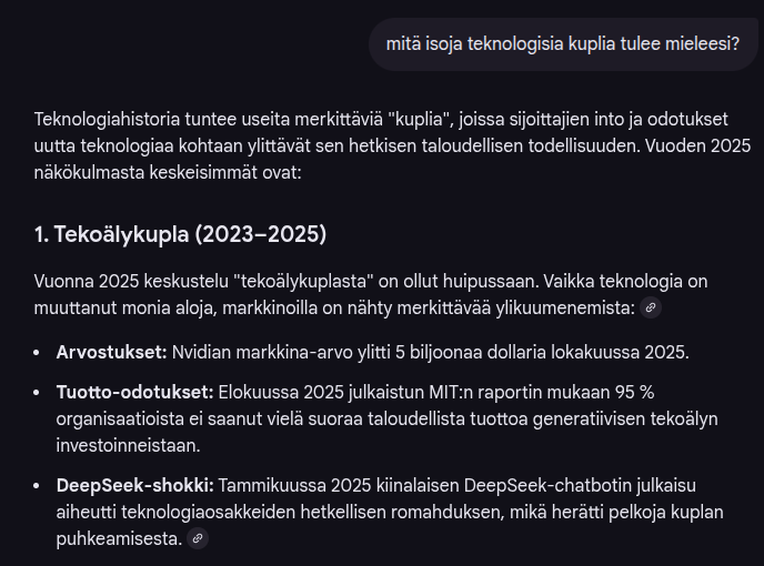 Tekoäly on tullut jäädäkseen, se on varmaa. Yhtä varmaa on se, että kupla pamahtaa iloisesti ja sillä on paljon suuremman vaikutukset, mitä nyt tahdotaan nähdä. Tämän humaltumisen jälkeen tulee ensin krapula ja sitten arki. Kuten se aina tulee. Sen myötä tämäkin työkalu asettuu uomiinsa valmiina tekemään päällystämään tietä seuraavalle innovaatiolle.